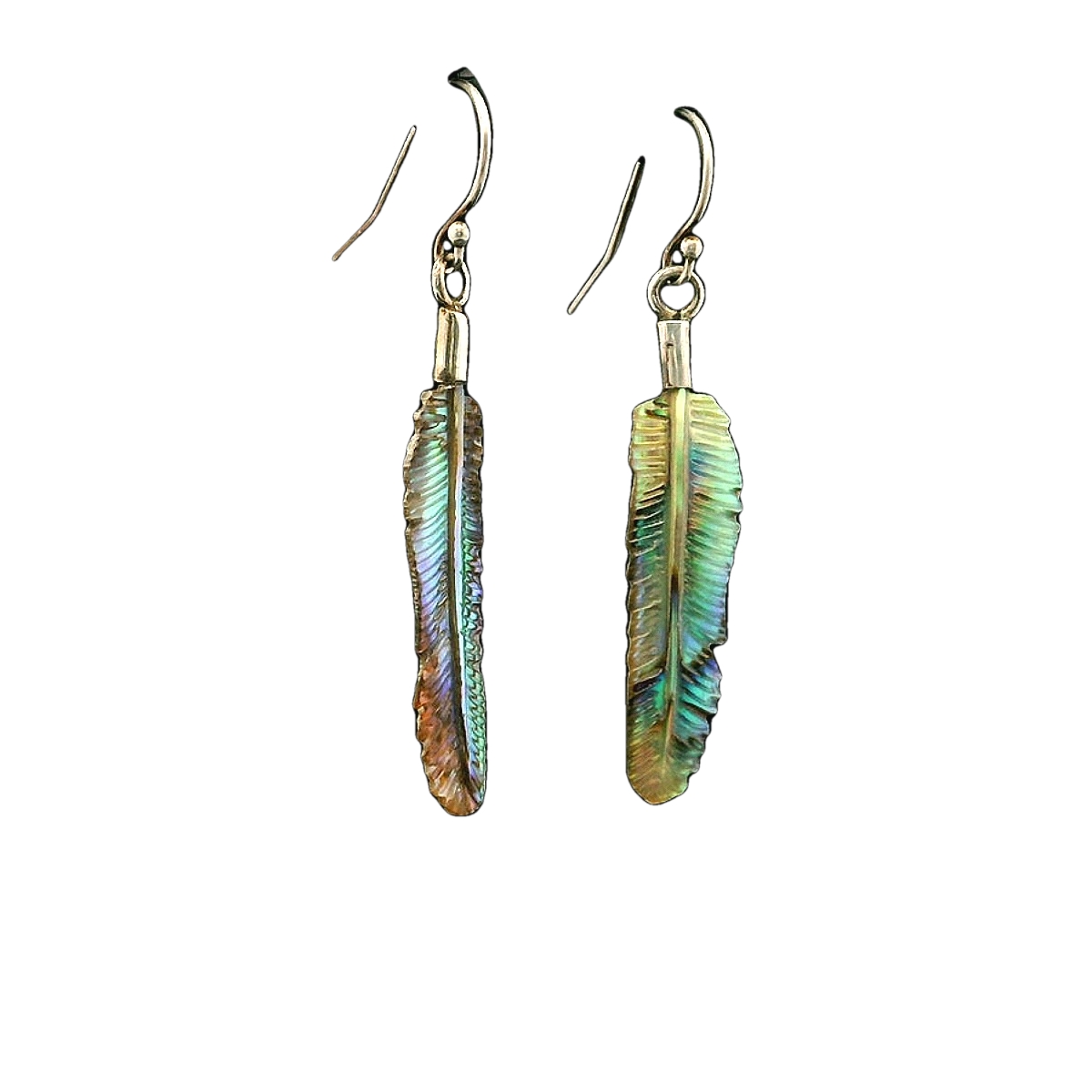 Earrings featuring carved feather-shaped elements made from abalone shell. The earrings exhibit a natural iridescence with a color range including green, blue, and hints of purple, characteristic of abalone. The feathers are suspended from a sterling silver or gold filled ear wires, which provides a secure attachment to the wearer’s ear. The overall design emphasizes the organic form of the feathers, showcasing the unique texture and color variations inherent to the abalone material. The earrings are designed for pierced ears and demonstrate a lightweight construction suitable for comfortable wear. Hand carved in Bali.