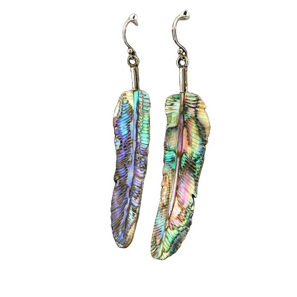 Earrings featuring carved feather-shaped elements made from abalone shell. The earrings exhibit a natural iridescence with a color range including green, blue, and hints of purple, characteristic of abalone. The feathers are suspended from a sterling silver or gold filled ear wires, which provides a secure attachment to the wearer’s ear. The overall design emphasizes the organic form of the feathers, showcasing the unique texture and color variations inherent to the abalone material. The earrings are designed for pierced ears and demonstrate a lightweight construction suitable for comfortable wear. Hand carved in Bali.