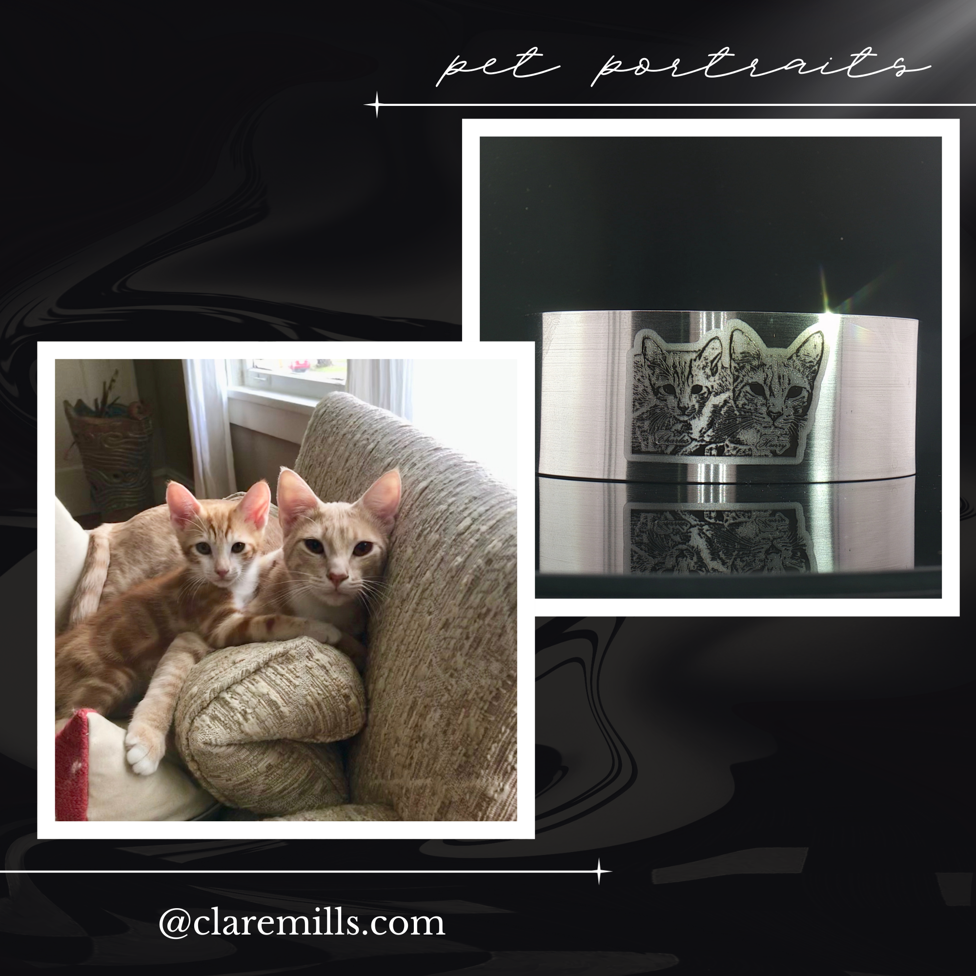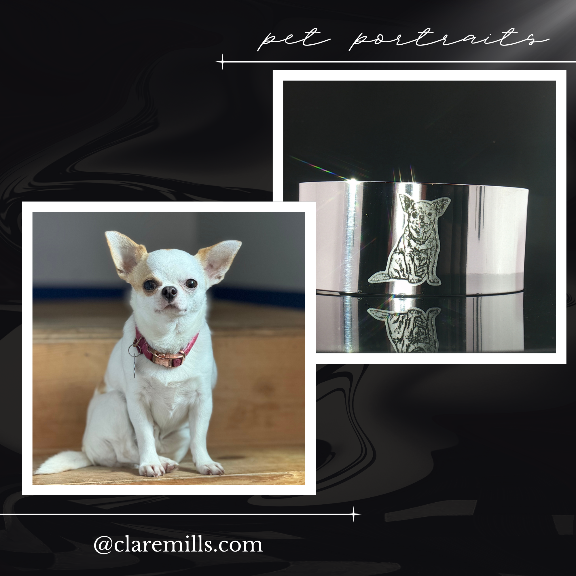 • Engraving: custom pet portrait from your photo; ultra-crisp deep laser etch