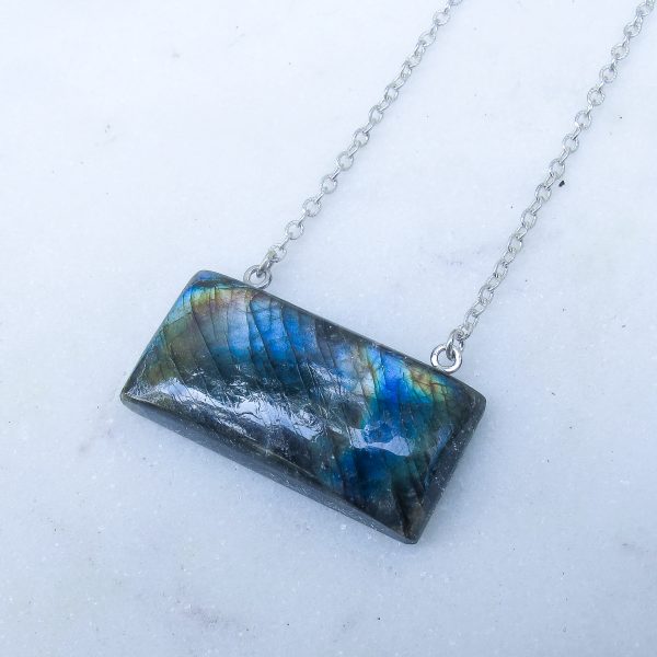 This gorgeous customed drilled bar labradorite stone hangs from sterling silver cable link chain at 16 inches with a two inch extender.