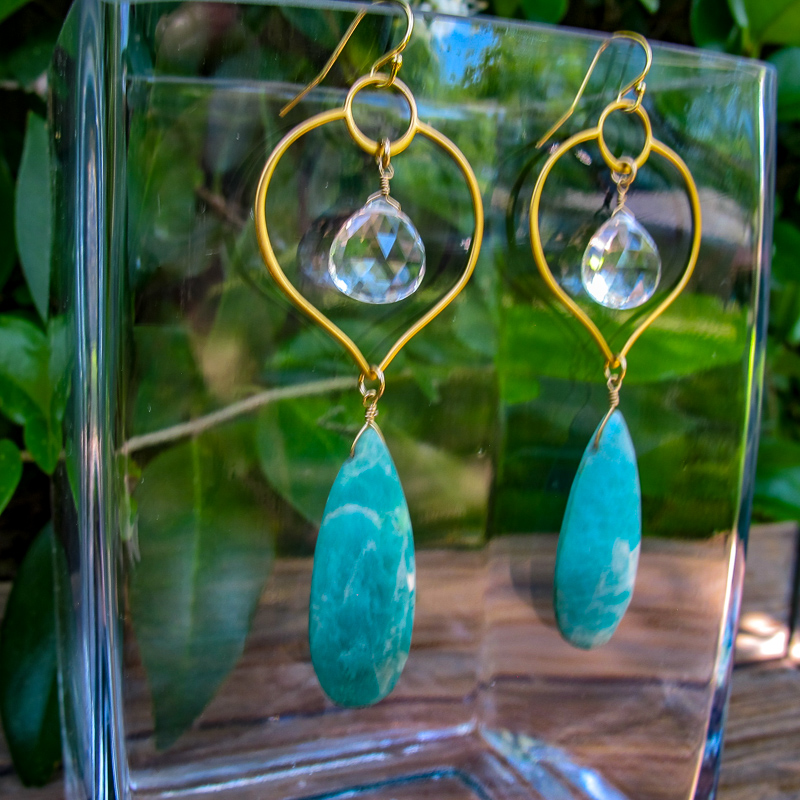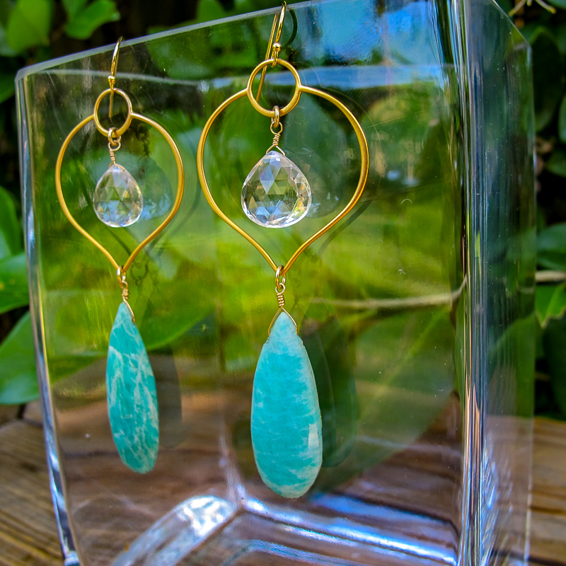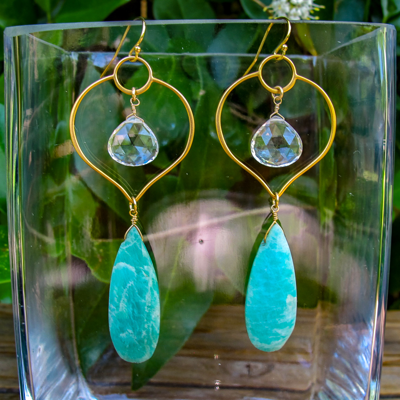 Vermeil lotus frames clear quartz stone with a amazonite teardrops. Love this color combo!