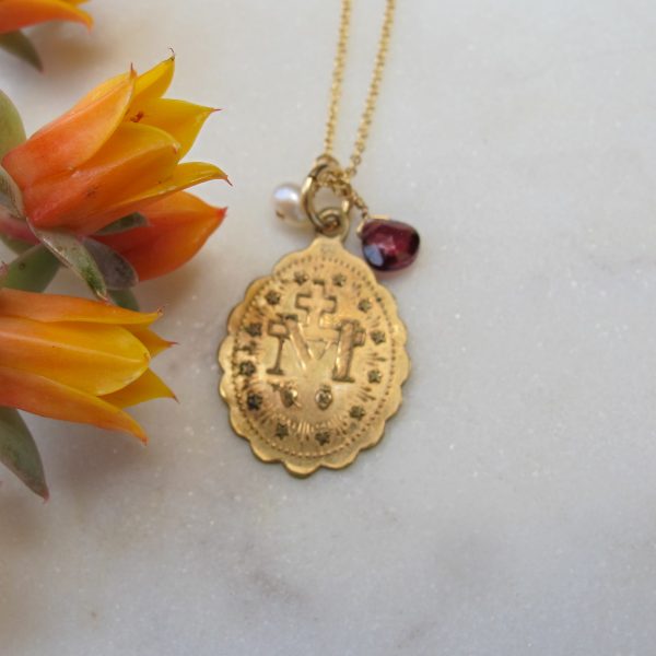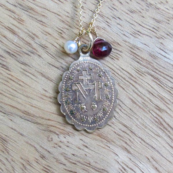 This beautiful necklace is made up of an authentic antique religious scalloped medal picturing Miraculous Mary accented with pearl and garnet drops. The necklace hangs at 16 inches with a two inch extender on gold filled cable link chain.