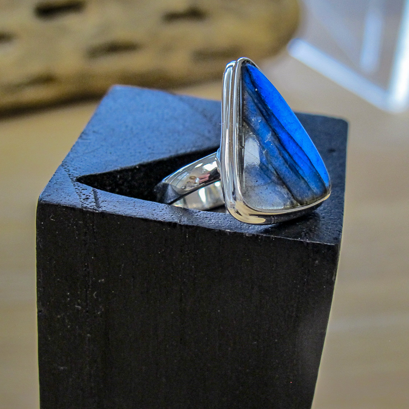 This stunning bezel set labradorite ring has deep blue tonal labradorescence and set in sterling silver. Absolutely Stunning!